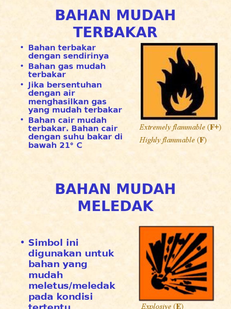 Simbol Tanda Bahaya, Melalui peraturan tersebut dibuatlah suatu simbol simbol yang menandakan sifat berbahaya dari suatu bahan kimia Simbol simbol bahan kimia tersebutlah yang akan dijelaskan pada artikel kali ini Simbol Bahan Kimia Simbol bahaya kimia adalah suatu piktogram berlatar belakang orange dengan garis batas dan gambar berwarna hitam